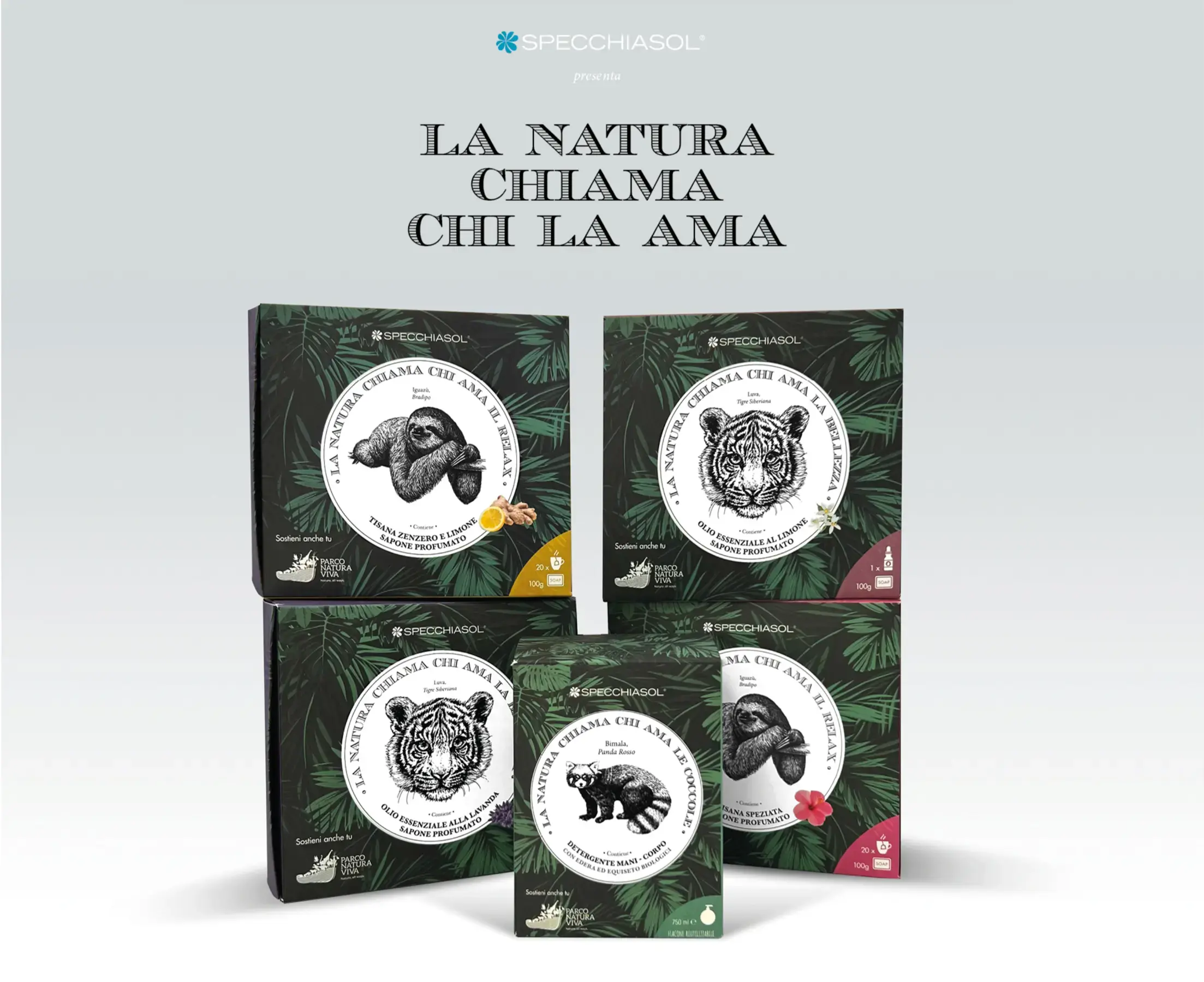 Ci siamo presi cura di chi si prende cura del benessere della persona e anche delle specie a rischio di estinzione. “La Natura chiama chi la ama” è la linea di prodotti firmata Specchiasol a tutela degli animali ospiti di Parco Natura Viva: un progetto a cui abbiamo dato un’identità ideando concept, naming, visual, video, grafica dei 5 cofanetti e dei prodotti contenuti all’interno, materiale per il punto vendita e folder di vendita.