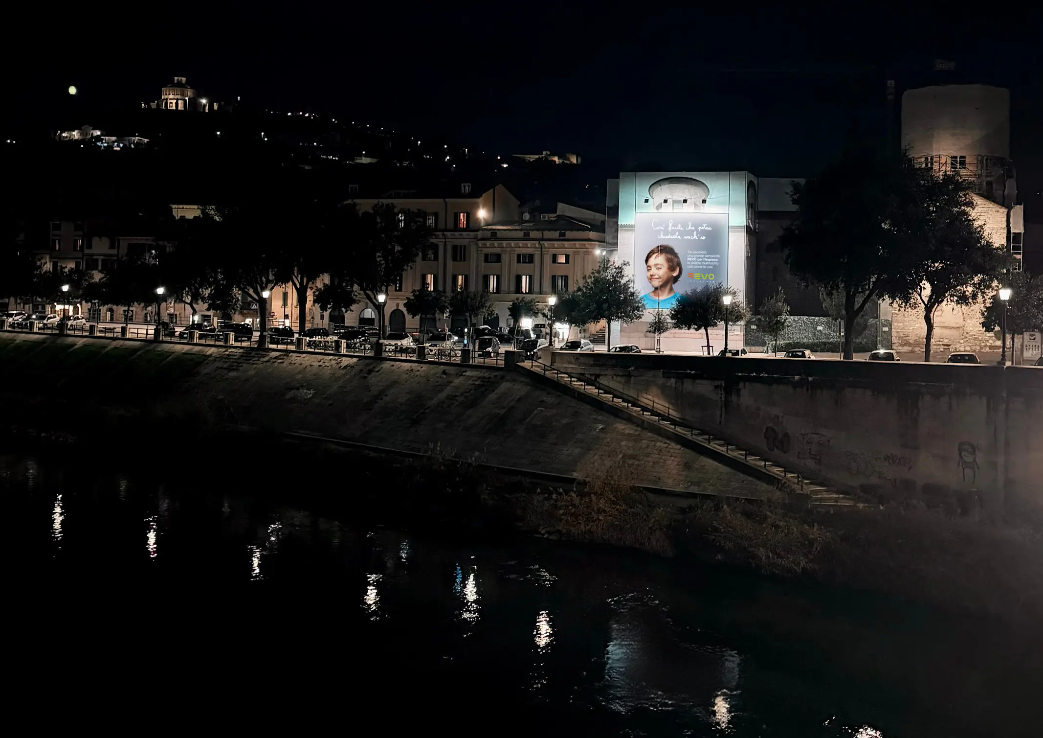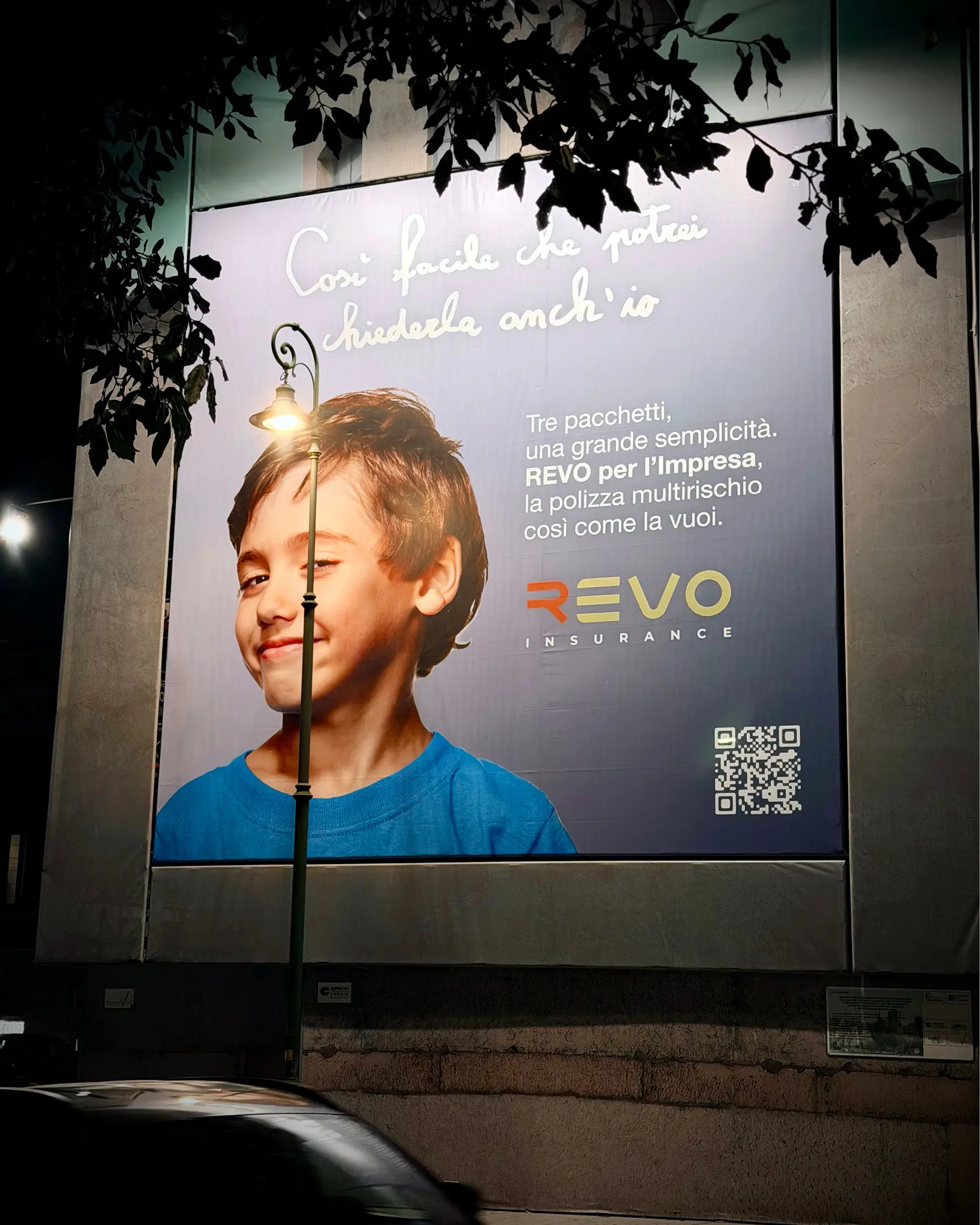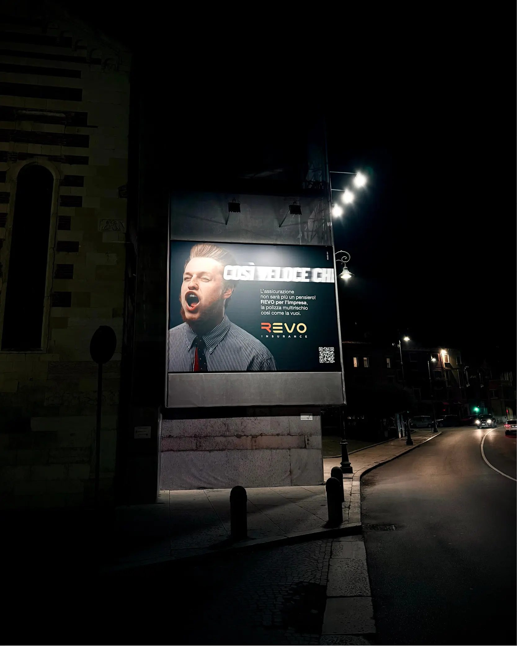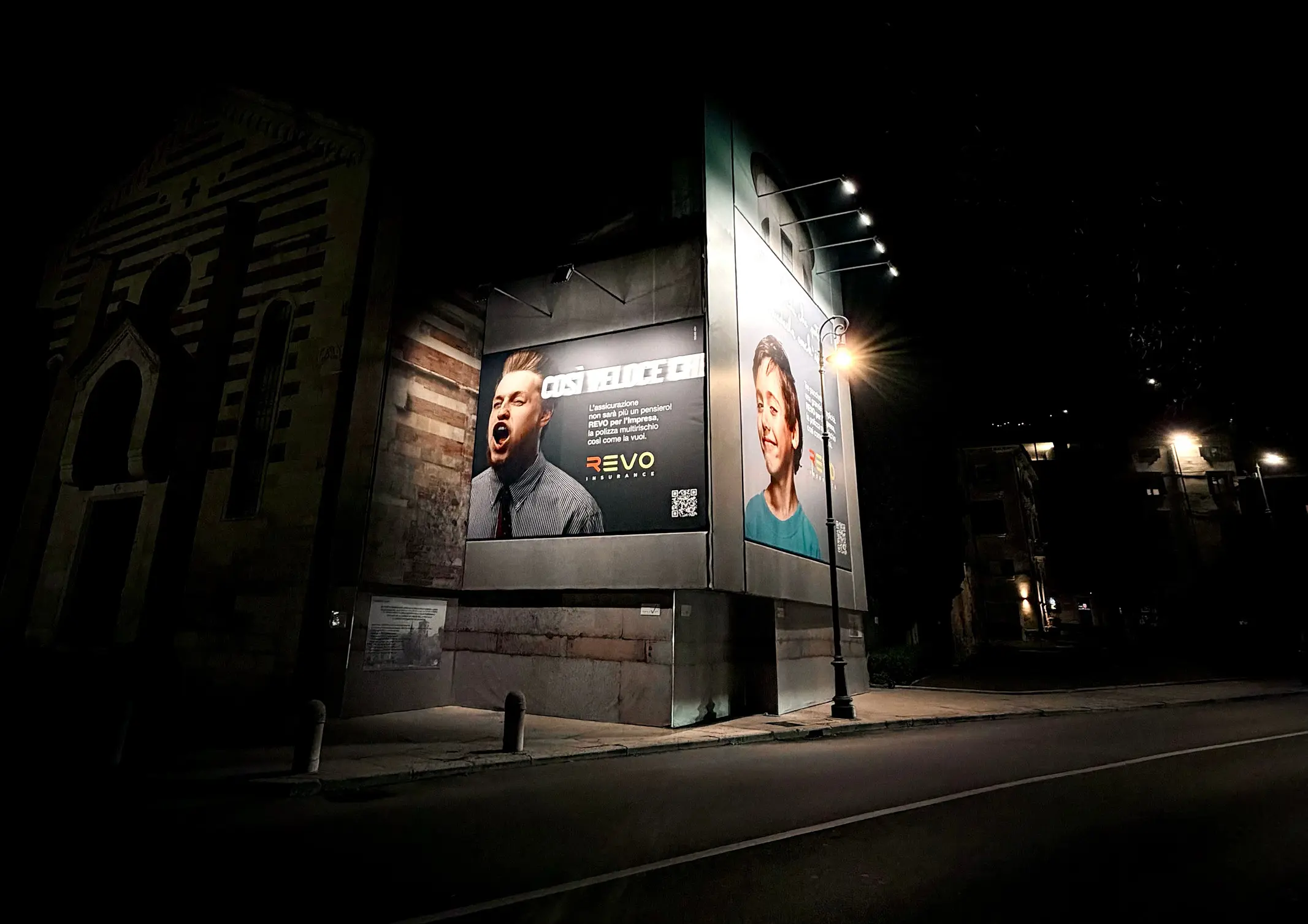 La nuova adv per il lancio della copertura multirischio "REVO per l'Impresa" è oggi in maxi-affissione sulle facciate della chiesa di Santo Stefano a Verona. Una creatività in doppio soggetto che occupa i due angoli dell'edificio: una location tra le più ambite della città per visibilità, passaggio, prestigio.