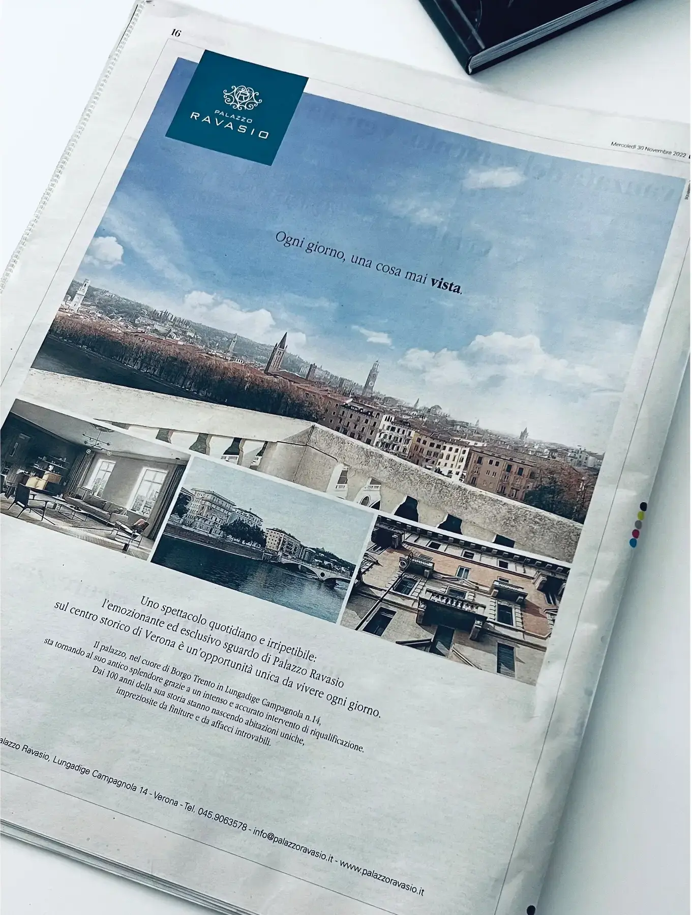 Non c’è caffè e brioche senza le pagine de l’Arena. Il quotidiano più letto nei bar della città e dai veronesi ospita oggi la creatività firmata SQUEE per Palazzo Ravasio: un recupero architettonico di un palazzo storico a due passi dal centro con una vista panoramica unica. Proprio la vista è protagonista del visual e del messaggio: uno spettacolo irripetibile e quotidiano per chi sceglie questa proposta immobiliare.